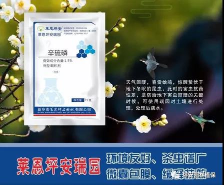 化學(xué)防治是防治園林地下害蟲最有效、最經(jīng)濟、最直接的防治措施。化學(xué)防治具有比較高效、持效及經(jīng)濟等優(yōu)勢,在地下害蟲危害比較嚴重時作為應(yīng)急措施使用??墒褂萌R恩坪安瑞園進行防治地下害蟲,本品原藥使用除臭后的辛硫磷,刺激味道更小,對環(huán)境友好。采用微囊包裹緩釋技術(shù),持效期長,2-4kg均勻撒施333㎡然后再澆水。建議在05:00—06:00進行施藥,主要由于地下害蟲大多在夜間活動,既能快速殺死地表及淺層的害蟲,又能將較深土層中的害蟲殺死,對蠐螬、螻蛄、地老虎等具有較好的殺滅效果。